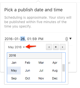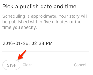 Note: Your story will be published within five minutes of the time you specify. All publish times are in your local timezone.